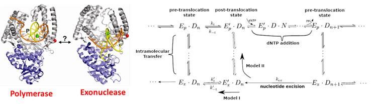 DNA 聚合酶(DNA polymerase)司职DNA 复制,是细胞中最重要的信息分子机器。它不仅是分子生物学和生物物理学研究的重要对象,并且已经有多种DNAP 广泛应用在DNA 体外扩增(PCR 技术)、单分子测序、生物计算机等方面,具有极大的应用潜力。作为遗传信息的复制者和守护者,DNA聚合酶不仅要快速合成新生DNA,而且要确保复制出错率尽可能低(高保真)。为此,DNA聚合酶进化出了专门的“校验”位点来减小复制差错率。综合最近的实验数据,我们最近对DNA聚合酶提出了一个完整的“聚合-校验”动力学理论模型,进行了详细的模拟和解析计算,结果表明DNA聚合酶可以高效地利用高阶末端近邻效应来完成校验。本工作分为两部分。第一部分按照生物化学家的惯例,忽略复制模板DNA序列的特异性,将复制过程近似简化为配对(R)-误配(W)的稳态共聚过程,建立相关的动力学主方程并提出了一种解析计算的方法,对复制保真度给出了简明直观的解析表达式。相关文献:J.Phys.: Condens.Matter, 27(23):235105 (2015);J.Phys.: Condens.Matter 29:025101(2017) [本文被该杂志选为2017年年度亮点工作,http://iopscience.iop.org/journal/0953-8984/page/Highlights-2017] 。第二部分工作则最大程度上考虑了模板序列的特异性以及相应的复制过程的非稳态特性,建立了基于首达过程概念的一种解析计算方法,对任意模板位置处的局域保真度和复制速度都给出近似的解析表达式,与前述稳态分析的结果一致。这个分析方法适用于任意DNA模板序列,且能够推广到RNA合成(基因转录)等其它过程,因此具有极大的普适性。相关文献:Template-specific fidelity of DNA replication with high-order neighbor effects: A first-passage approach, Phys. Rev. E, 2019, 100, 012131.